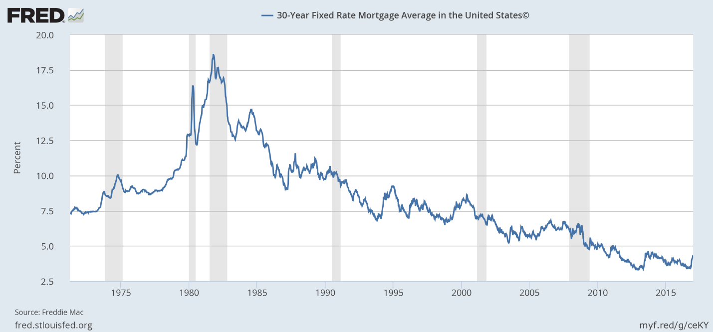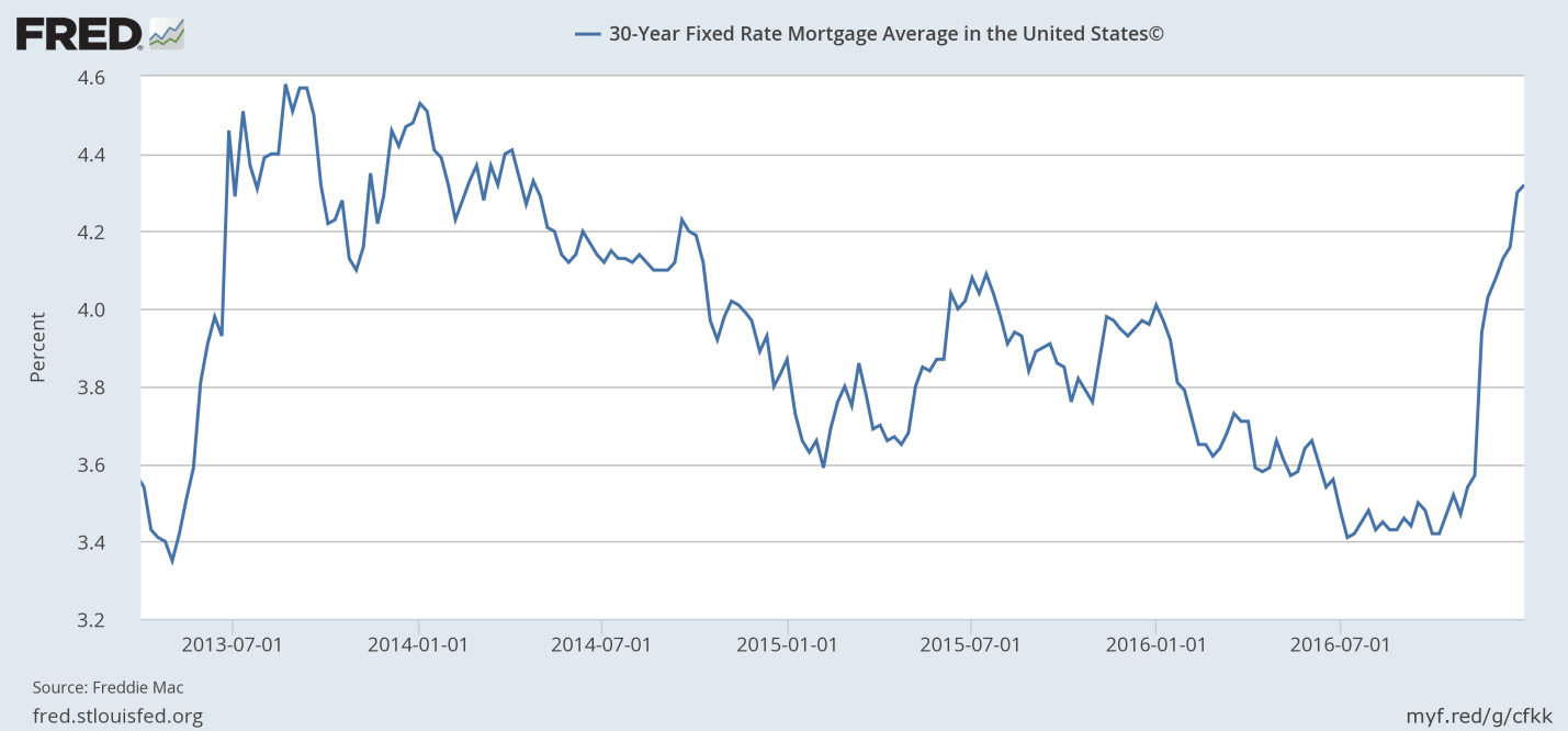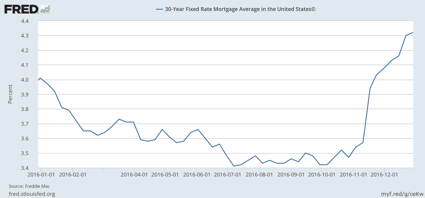 That’s what the average 30yr fixed mortgage rate has done, in the wake of the Presidential Election and Trump becoming our President Elect. It’s even more interesting, because the eve of the election, most analysts and pundits were predicting the exact opposite, IF Trump were to win. So much for analysts and punditry.