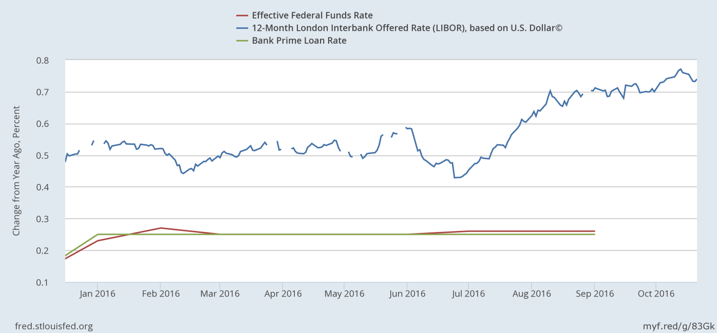 And, although the LIBOR is not directly tied to the Federal Funds Rate (whereas Prime does mirror the Fed Funds Rate) if the Fed Funds rate increases in December, it’s very likely the LIBOR will continue creeping up, as it has been. And, right now, in many cases, you can secure fixed financing than you may be paying on an ARM if it’s in the adjustment period.