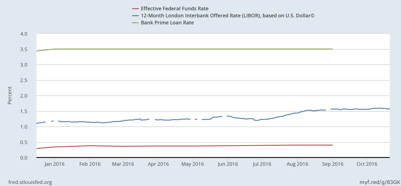 As you’ll see in the chart below, the Federal Funds Rate sits at a target of .5%. Prime is 3% higher, at 3.5%, and the 12-month LIBOR is at 1.5% or so: